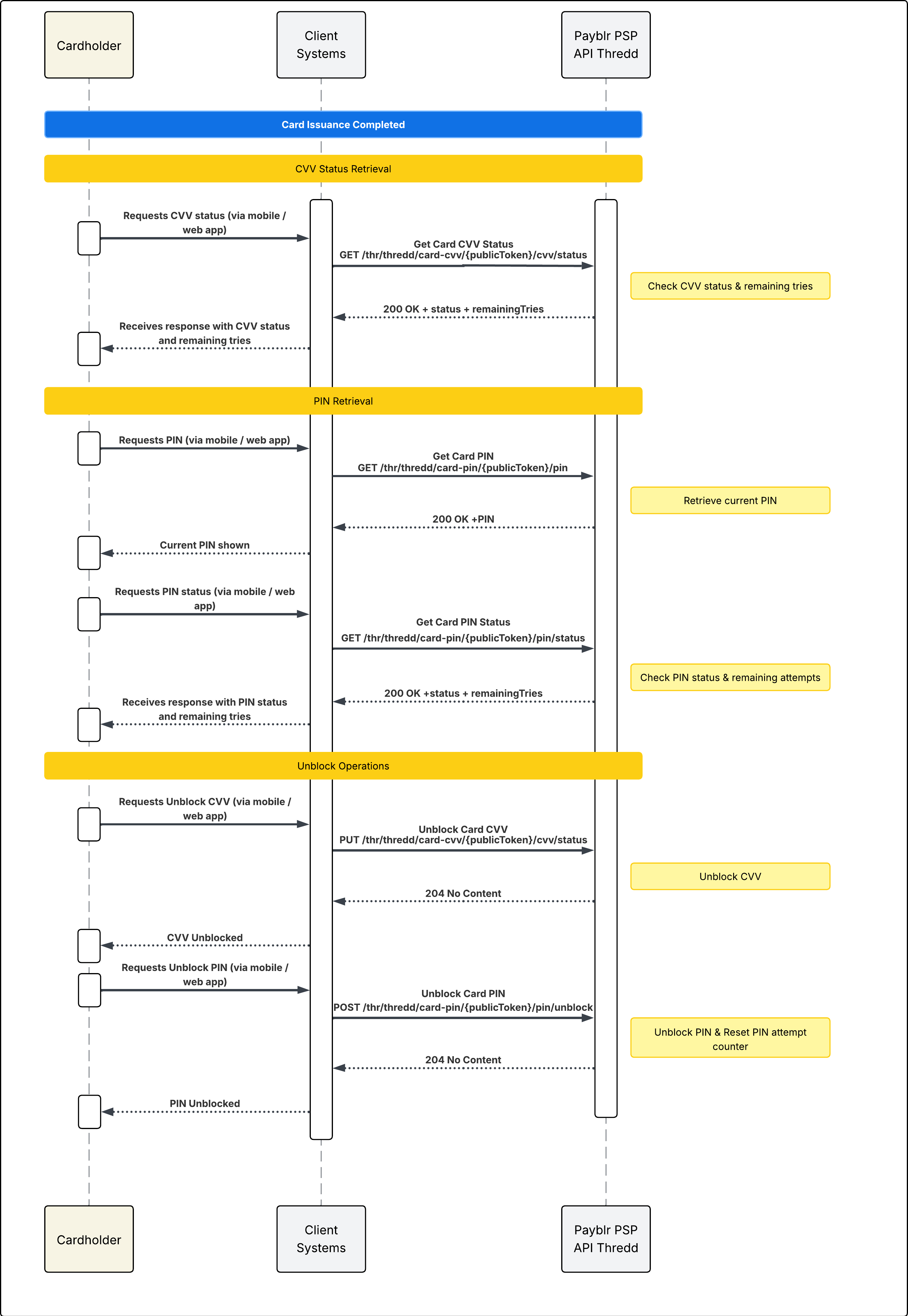 After card issuance is complete, your system can use the Payblr PSP API to retrieve CVV status and PIN information, and perform unblock operations when supported. In this flow, the cardholder interacts with your mobile or web application, while your system sends the corresponding requests to Payblr and returns the confirmed result to the cardholder.