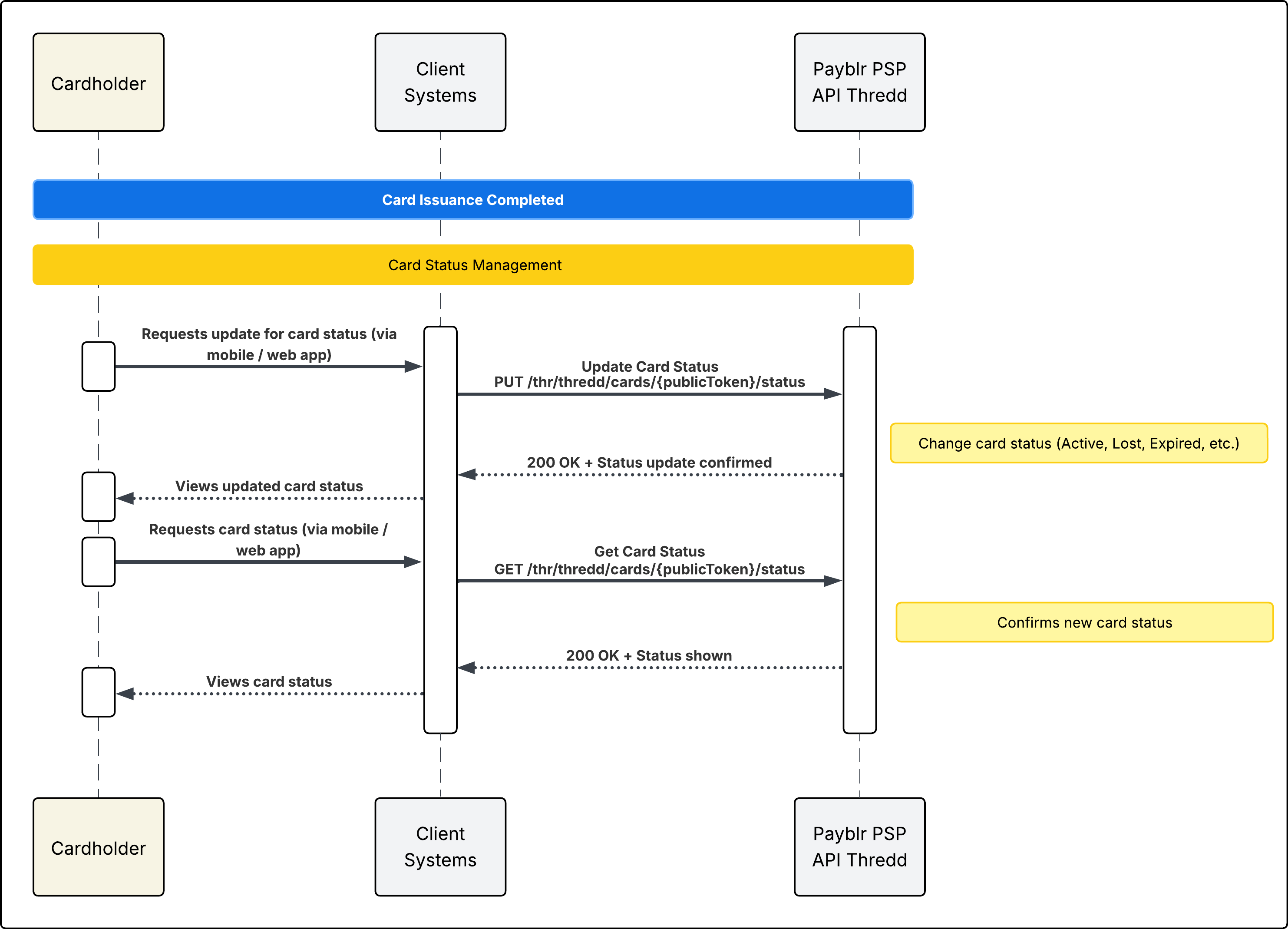 This sequence shows how an already issued card can be managed through your system after issuance. It focuses on two operations: updating card status and retrieving card status. The update call returns 200 OK on success, and the retrieve call also returns 200OK with the card’s current status information.