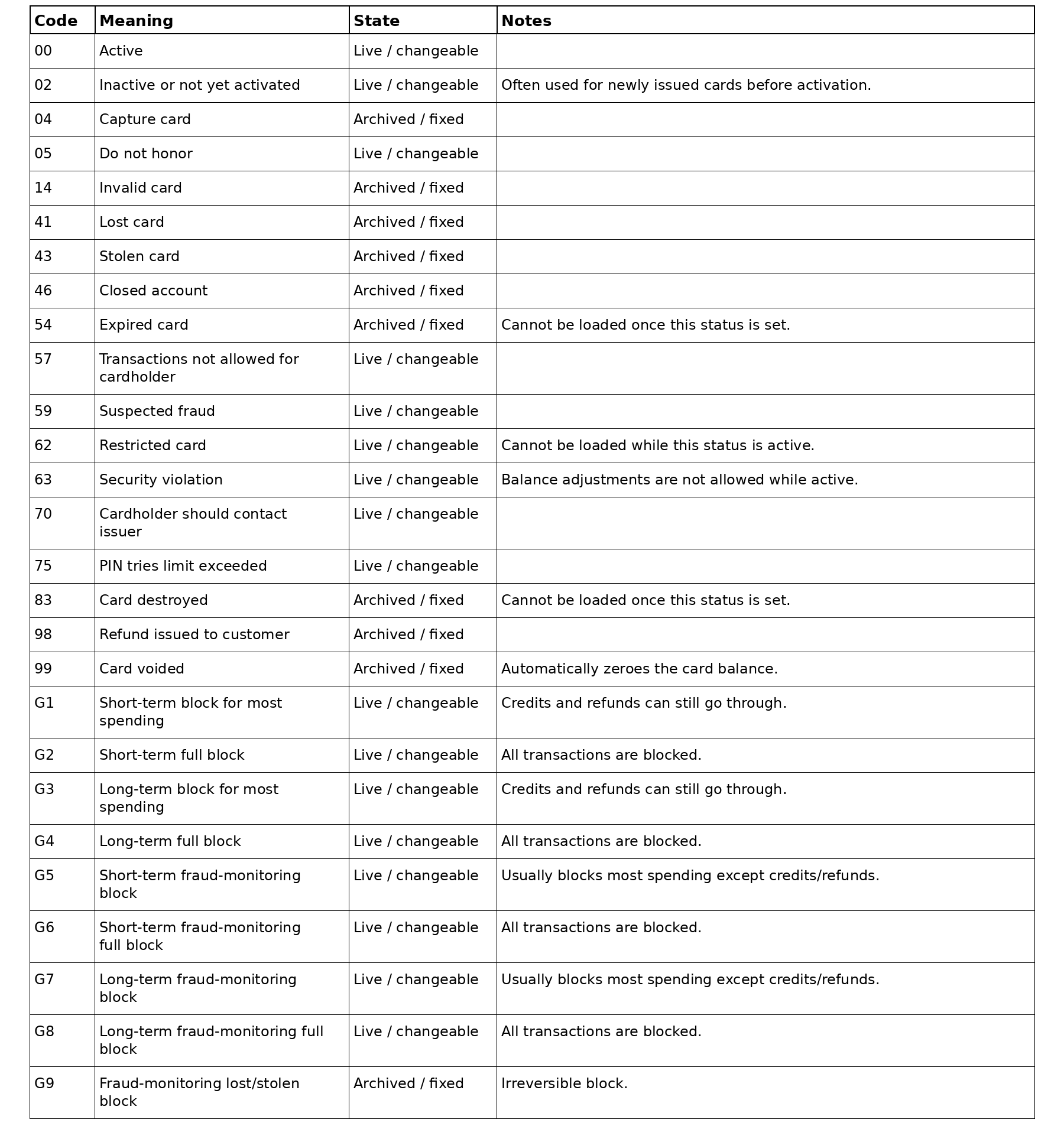 Card Status Codes